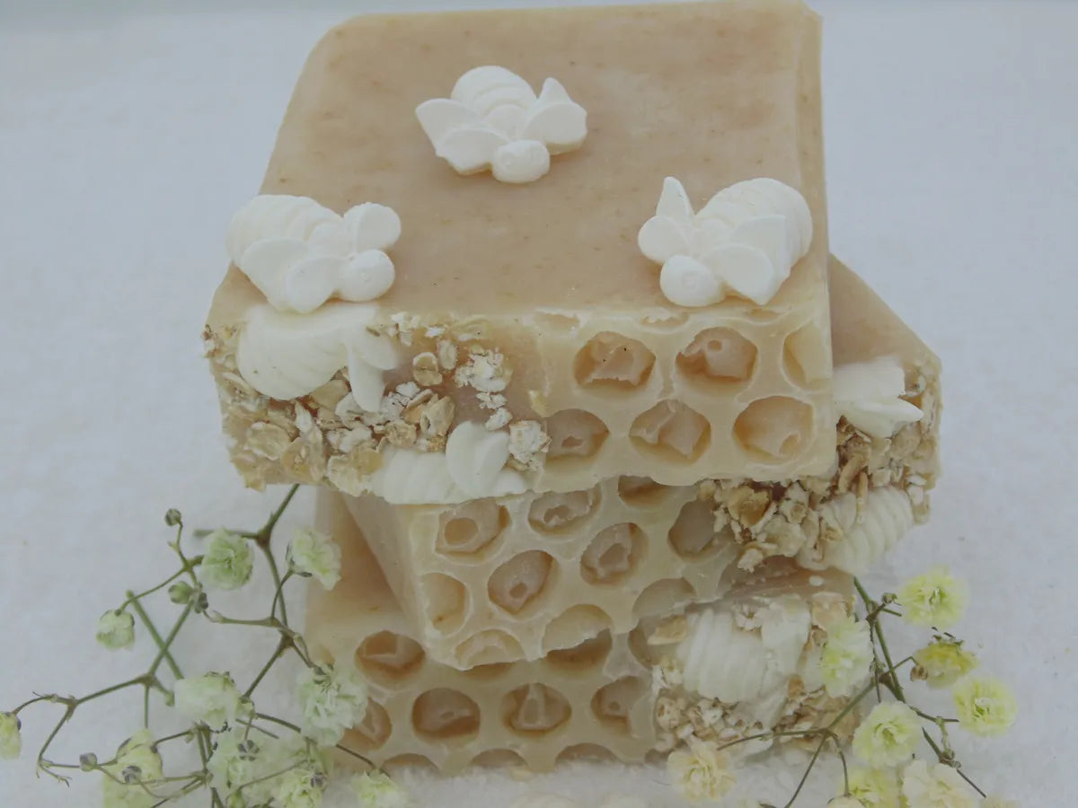 Oats are known for their anti-inflammatory properties. They can soothe dry and irritated skin, making them excellent for sensitive or eczema-prone skin. Oatmeal acts as a gentle exfoliant, helping to remove dead skin cells and promote a smoother complexion. Agave nectar soothes irritated skin and contains glycolic acid, which is beneficial for exfoliation. It helps maintain skin hydration. This is a nourishing, gentle bars that pamper your skin. This soap is not scented and contains nourishing butters and oils for your skin. The agave nectar helps to moisturize skin, soothe inflammation. A vegan honey alternative.